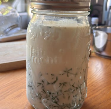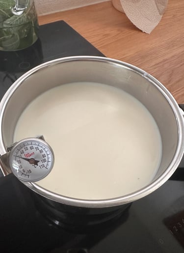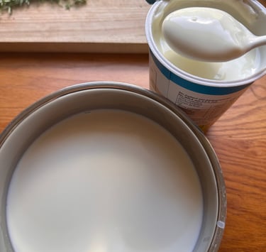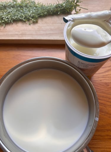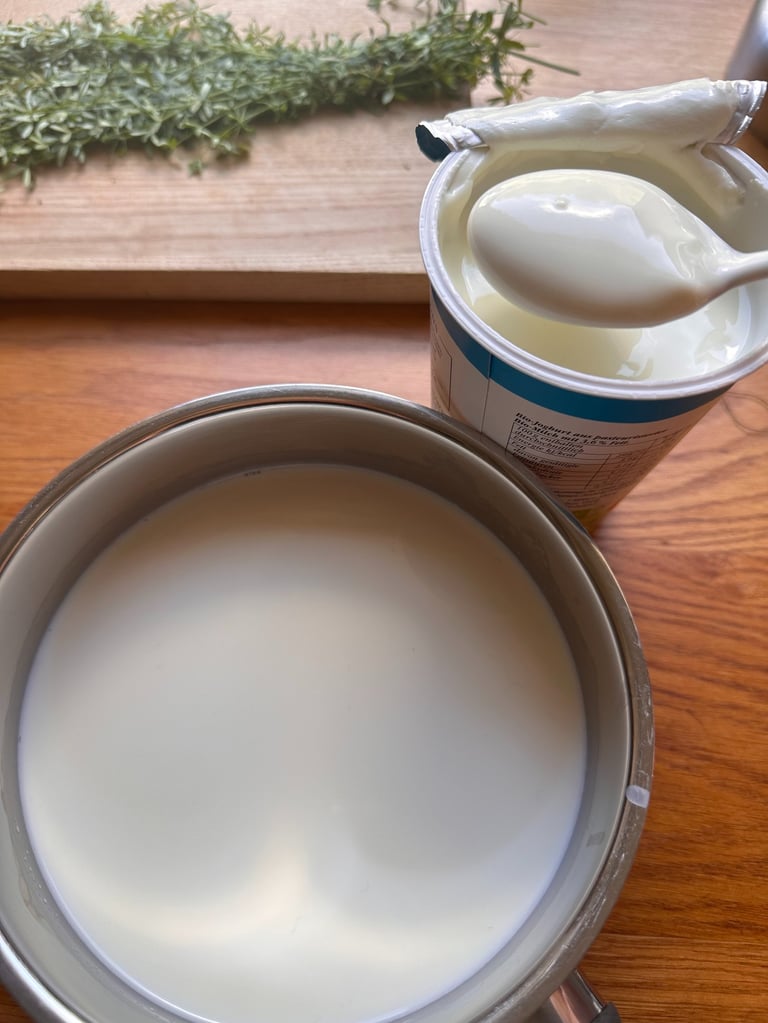 Zum Ansäuern gebe ich zwei Esslöffel Joghurt in die Milch und verrührt diese. Im Joghurt sind Milchsäurebakterien enthalten, die sich in der Milch vermehren.