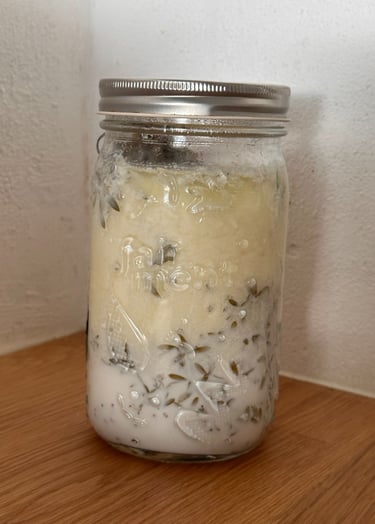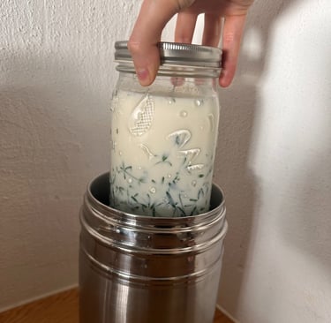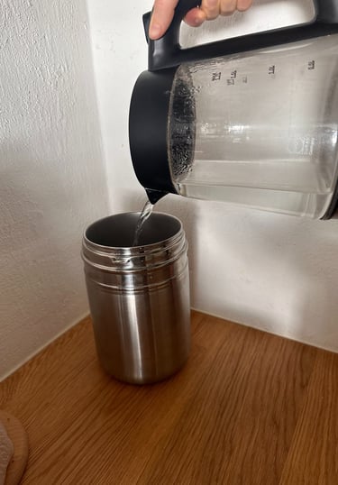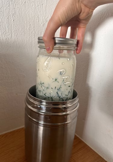 Lassen Sie das Ganze nun 24 Stunden an einem warmen Ort bei 30-40 °C stehen. Ich benutze dafür einen Joghurtbereiter aus Edelstahl, den du mit warmem Wasser füllst und nach ca. 12 Stunden das Wasser wieder neu erwärmen solltest. Achte darauf, dass du das Ganze nicht unnötig bewegst, da Milchsäurebakterien empfindlich reagieren. Alternativ kannst du dein Glas in Handtücher wickeln und eine Wärmflasche dazugeben, damit es nicht auskühlt.