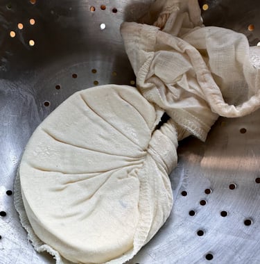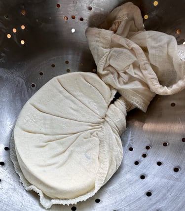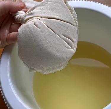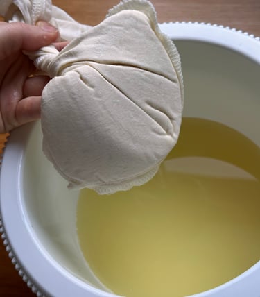 Sobald die Milch leicht fest geworden ist, entferne ich die Kräuter und gieße den Frischkäse in ein Tuch. Danach drücke ich leicht aus. Anschließend lege ich das Tuch in ein Sieb, beschwere es mit einer schweren Schüssel und lasse es über Nacht stehen, um die restliche Molke abtropfen zu lassen.