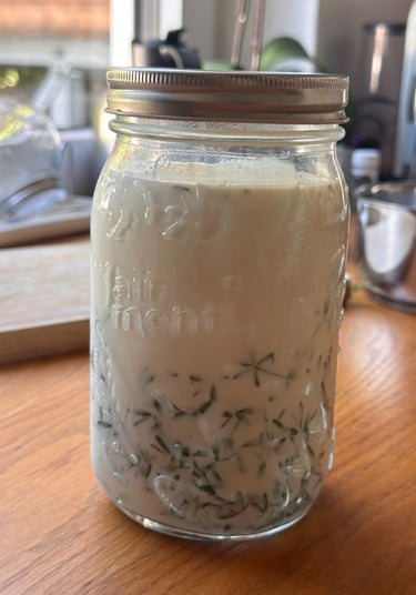 Geben Sie das Wiesen-Labkraut in die lauwarme Milch. (Tipp: Binde das Labkraut mit einem Faden zusammen, damit du es später leichter herausbekommst. Alternativ kannst du auch ein Teebeutelchen verwenden. Die Kräuter sollten in der Milch absinken.)